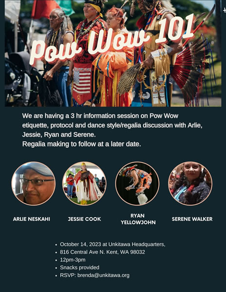 We are having a 3 hr information session on Pow Wow etiquette, protocol and dance style/regalia discussion with Arlie, Jessie, Ryan and Serene.Regalia making to follow at a later date.