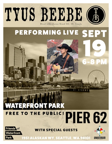 Tyus Beebe: Blood tribe, Kainai/Stand Off. AB Canada Performing live Sept 19, 6-8 PM Free to the public Pier 62 Info: wellness@unkitawa.org |